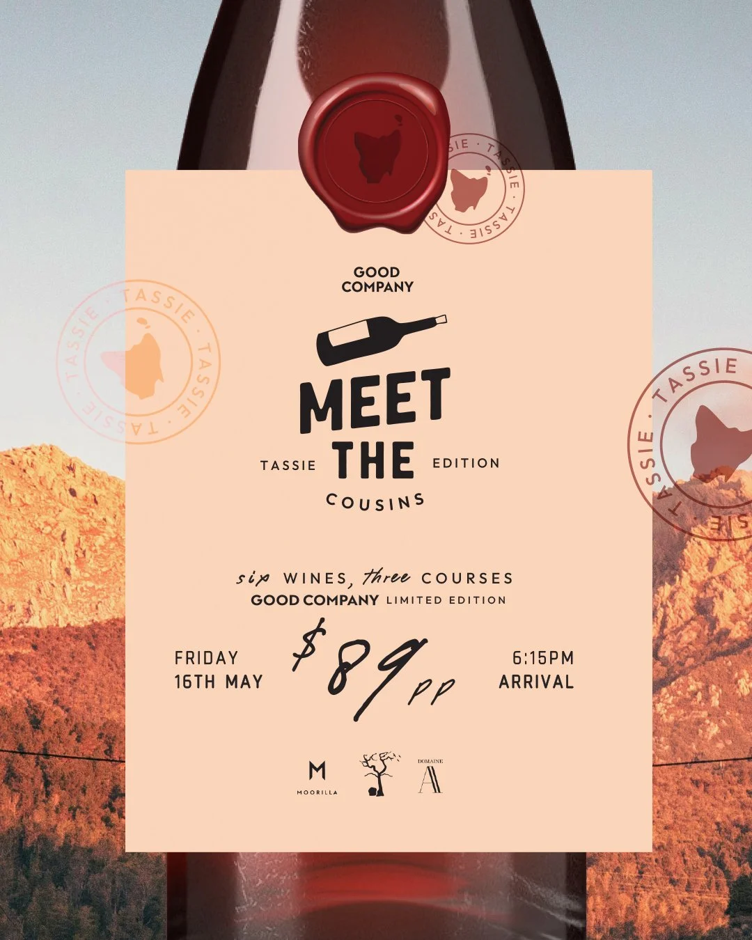 This project involved the design and creative execution of a themed wine dinner celebrating Tasmanian wines. The event concept and narrative, introducing Tasmania as our “cousin from over east”, was developed by the tpg team, with the aim of encouraging guests to step outside Western Australia’s familiar wine scene and explore a lesser-known region.