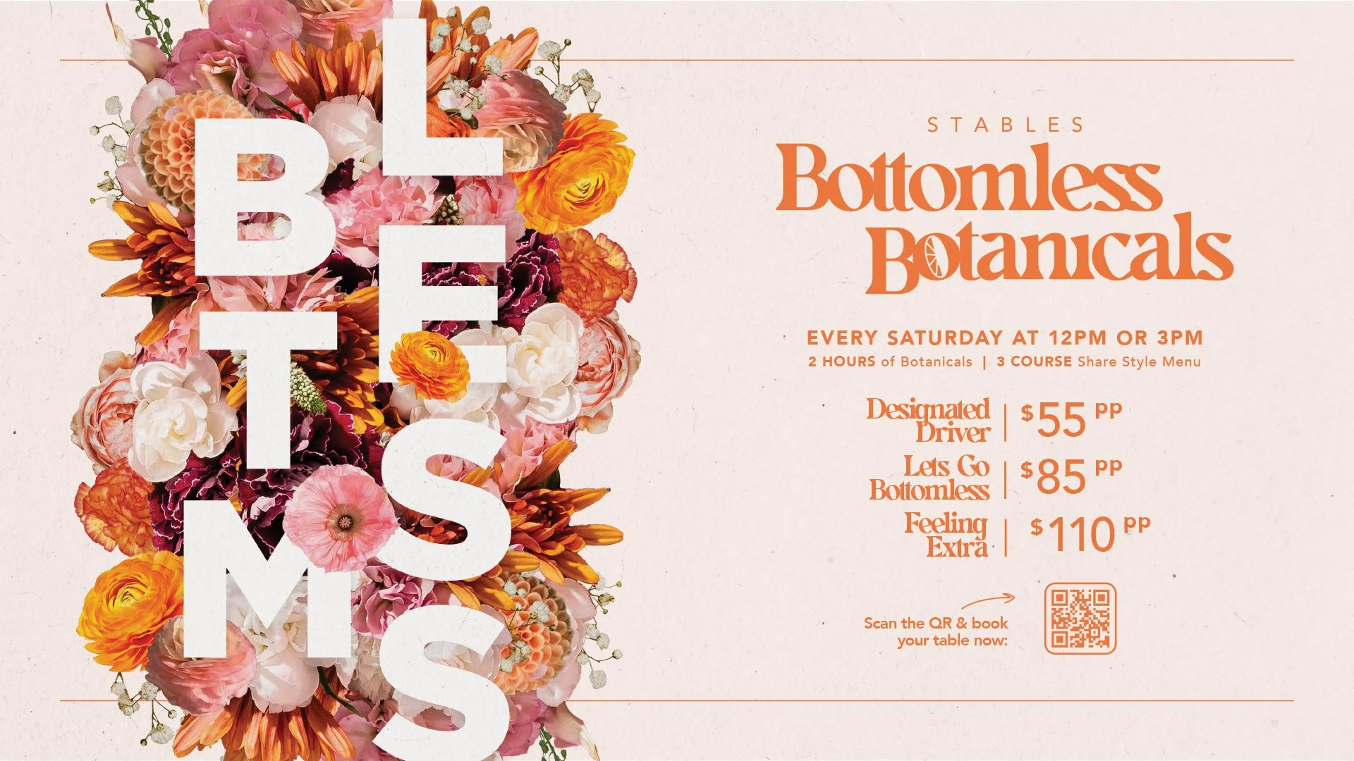 This project involved creating event artwork for Bottomless Botanicals, a botanically inspired bottomless drinks experience at The Stables. The target audience was young women, with a focus on hens parties, girls’ celebrations and social group outings.
