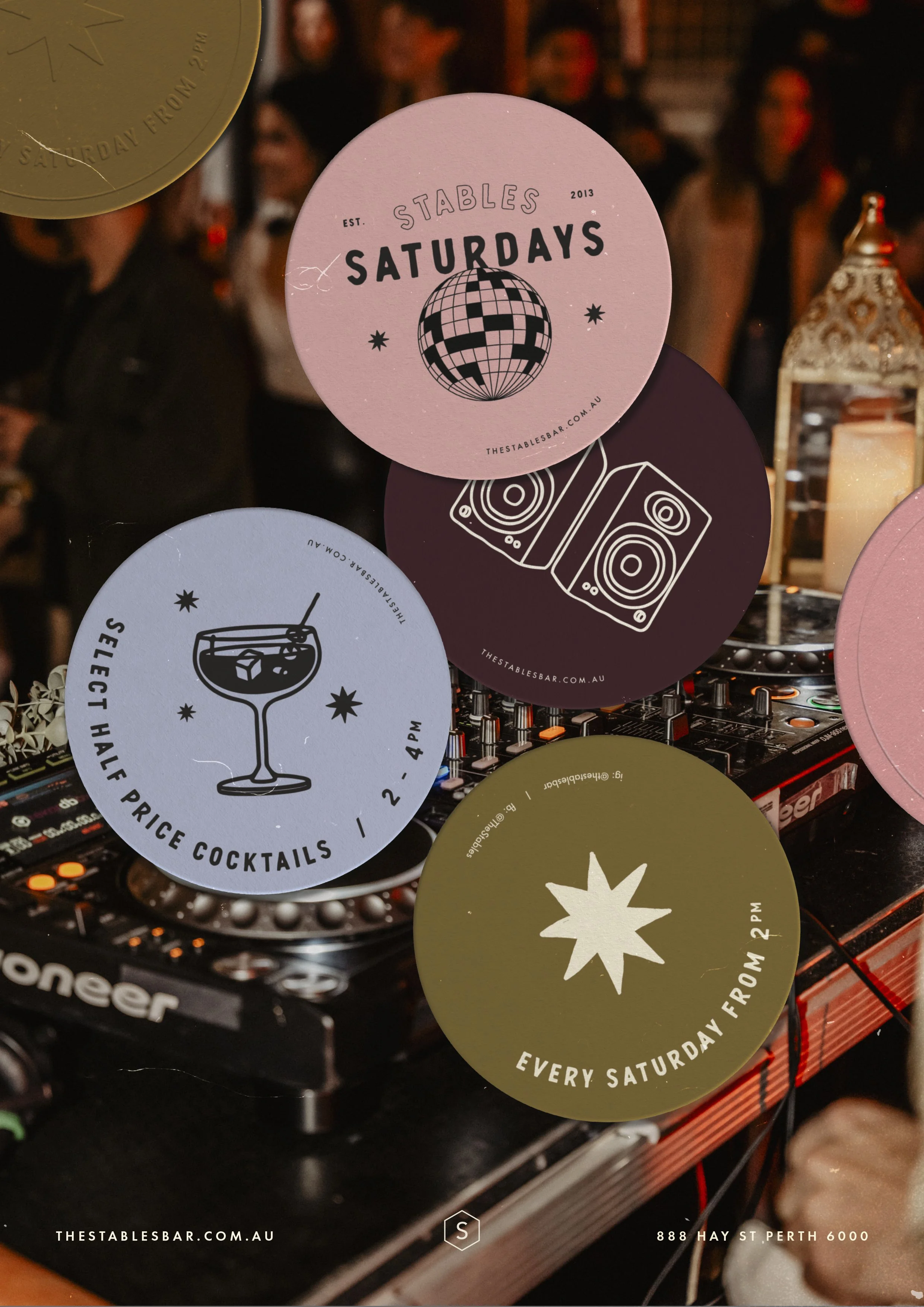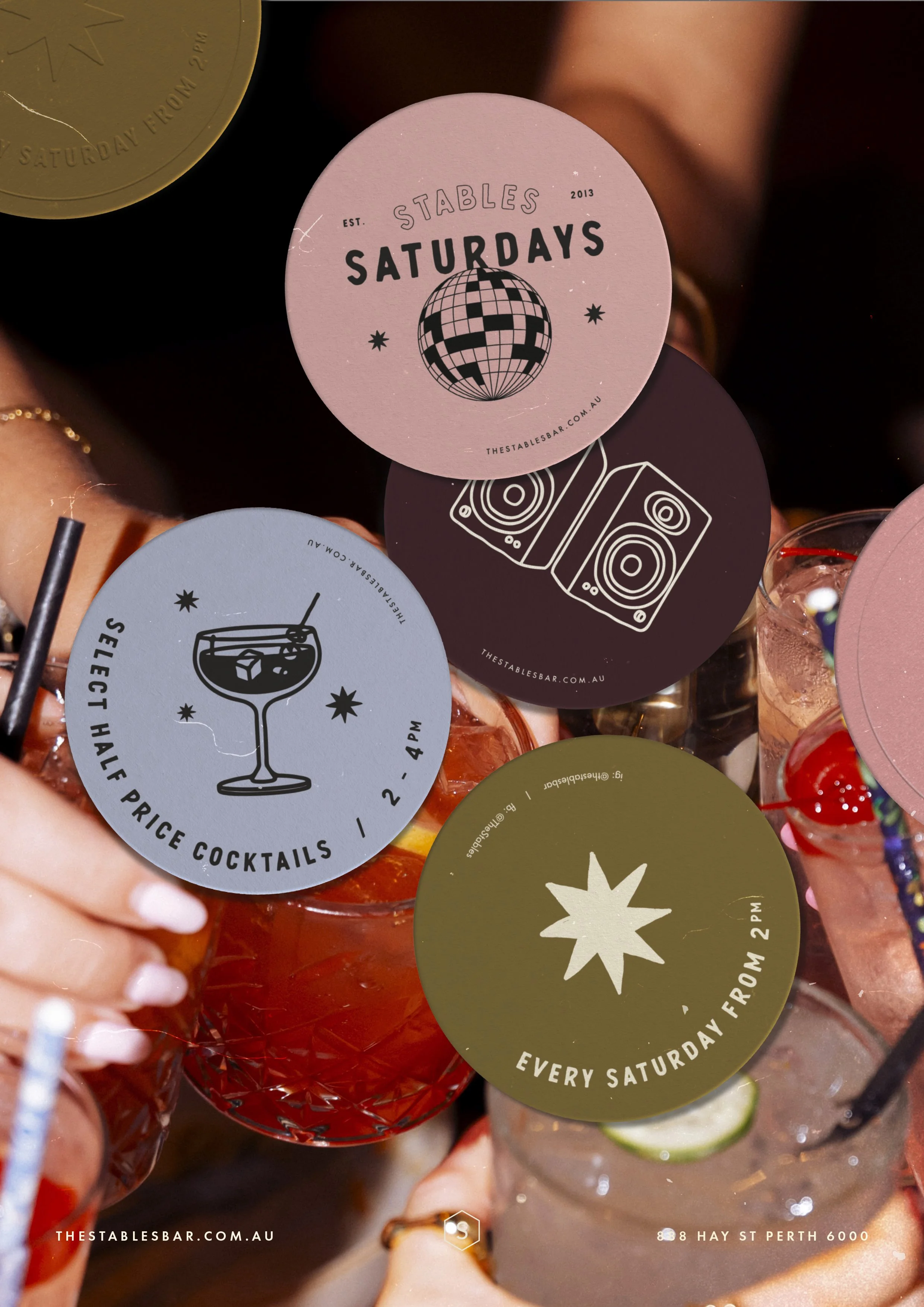The brief was to create eye-catching visuals that encouraged patrons of The Stables’ popular bottomless event to stay longer for Stables Saturdays, featuring live music and beverage specials. As a heritage bar with a fresh, modern twist, I developed a layered bar-coaster design system that allowed easy swapping of background imagery to suit different event themes. This approach not only kept the visuals dynamic and versatile but also extended into branded drink coasters distributed throughout the venue — a fun and tactile branding element that patrons often took home. The rich maroon tones paired with pops of pink and lilac were chosen to appeal to the venue’s core demographic of younger women aged 20–35, striking a balance between sophistication and playful vibrancy.
